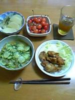 今日の夕飯は、宮崎の冷や汁と唐揚げに、山形産さくらんぼ♪