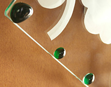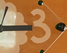 1)15cm x 15cmの正方形のガラス板に、ガラスエッチング技法で模様を描く。 2)出来上がったガラス板に、小さな粒ガラスを接着。 3)中央に時計のムーブメントを取付けて完成!! |